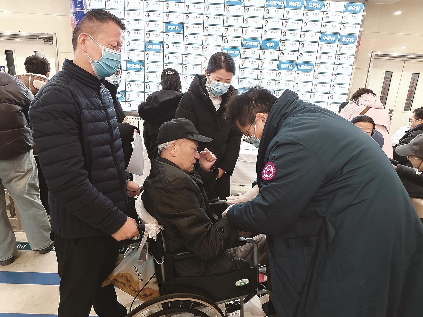 當(dāng)日上午9時許,包鋼三醫(yī)院門診大廳已經(jīng)是人頭攢動。大廳里的“包頭市‘防殘減殘助殘暖冬行動’篩查服務(wù)”指示牌格外醒目,抽血、CT、眼科、口腔等專設(shè)服務(wù)窗口前有許多殘疾人朋友在排隊等候,醫(yī)護人員引導(dǎo)殘疾人朋友接受檢查,來自北京的專家正在為一位坐在輪椅上的肢殘人士進行下肢功能檢查,手法專業(yè)而細致。