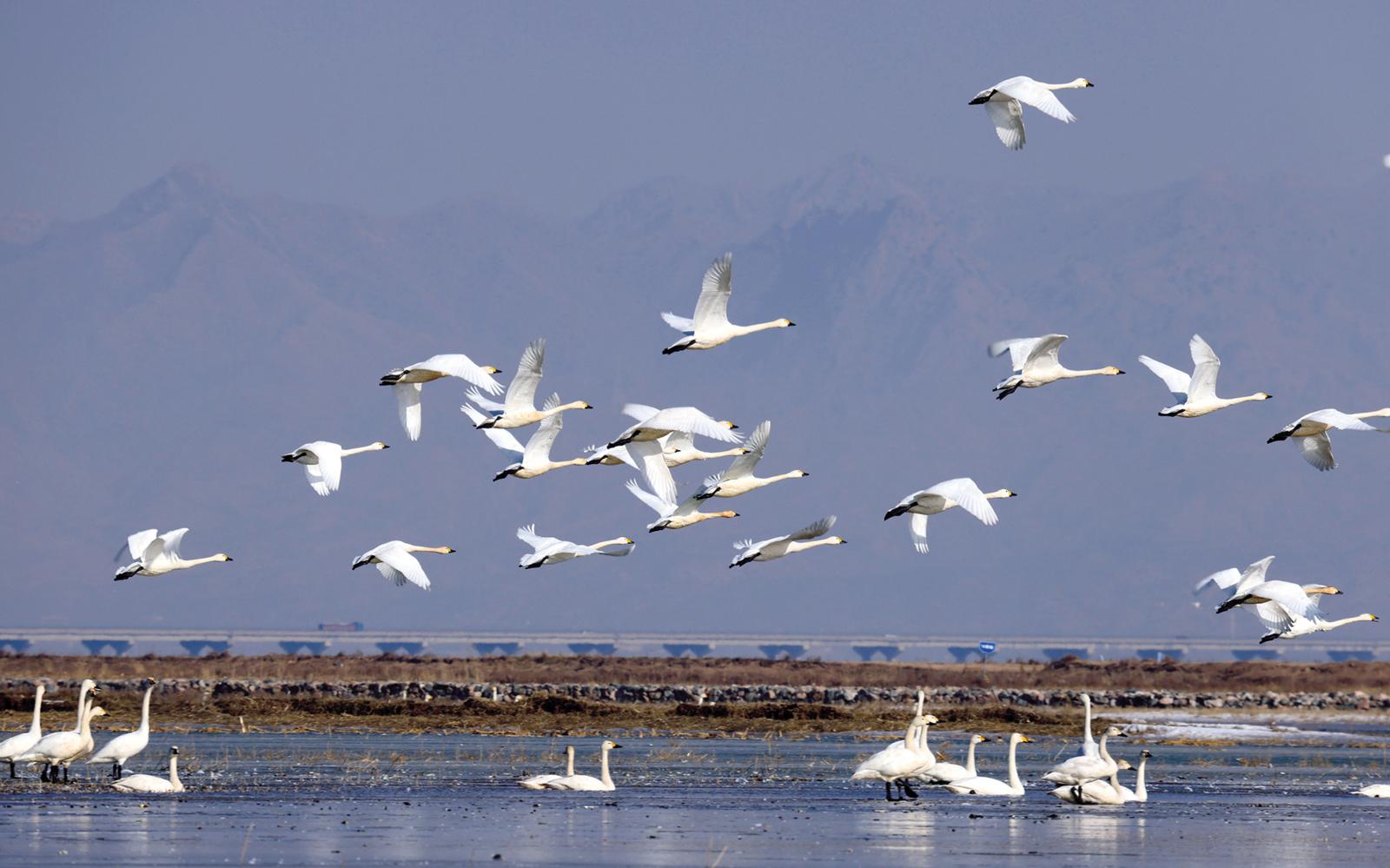 天氣日漸回暖,大批北歸候鳥飛臨黃河“幾字彎”逗留棲息。新華社記者 賈立君 攝