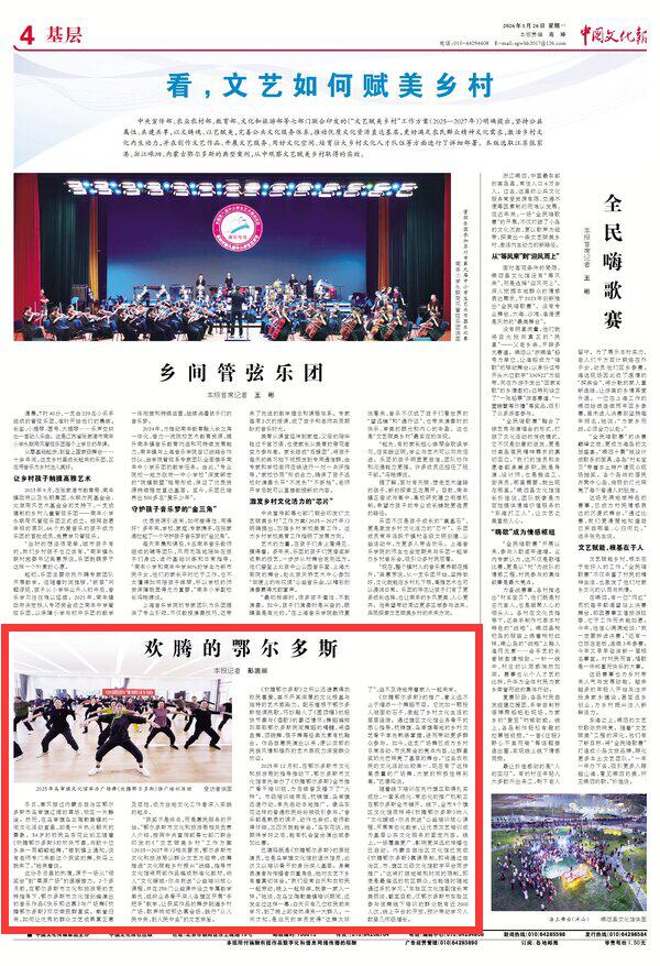 2026年1月26日《中國(guó)文化報(bào)》第4版刊發(fā)了《歡騰的鄂爾多斯》的文章,報(bào)道了廣場(chǎng)舞《歡騰鄂爾多斯》已成為鄉(xiāng)村日常活動(dòng)、節(jié)慶聚會(huì)的亮點(diǎn)內(nèi)容,讓群星獎(jiǎng)的光芒照亮了基層的舞臺(tái)。作品自惠民演出以來,便以濃郁的民族風(fēng)情和強(qiáng)烈的藝術(shù)表現(xiàn)力深受群眾歡迎。