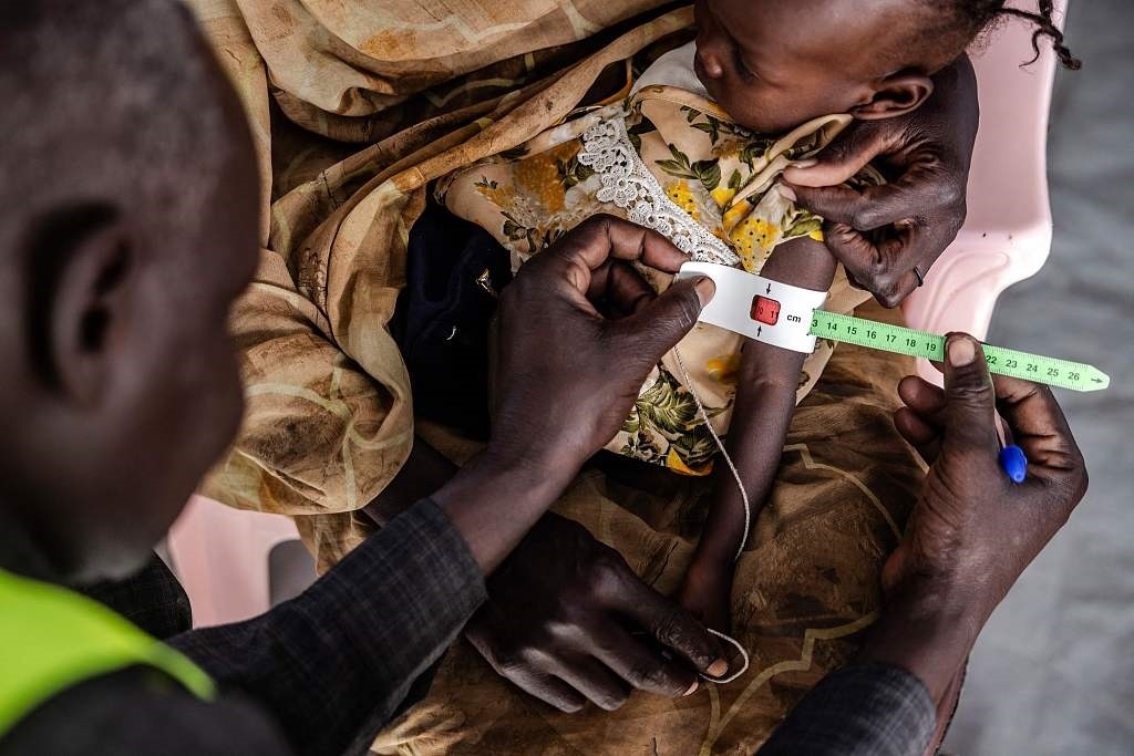 當(dāng)?shù)貢r間2024年2月13日,南蘇丹,在難民中轉(zhuǎn)中心的診所里,一名醫(yī)護工作人員在測量一名蘇丹兒童的手臂周長。