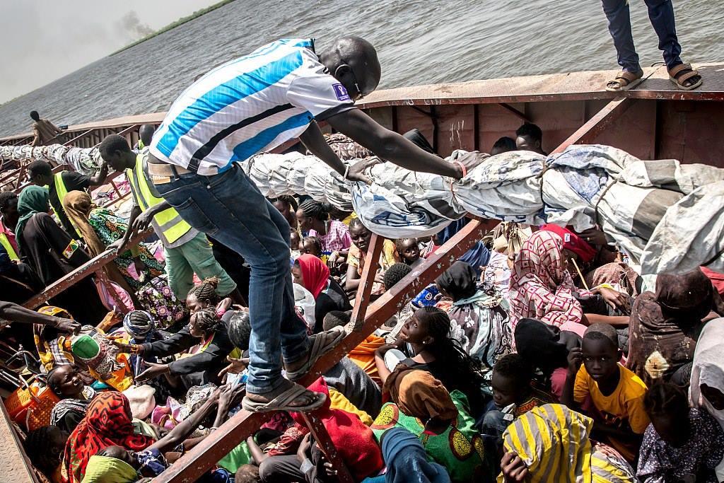 當(dāng)?shù)貢r間2024年3月21日,人們坐上船只抵達南蘇丹,逃離沖突。