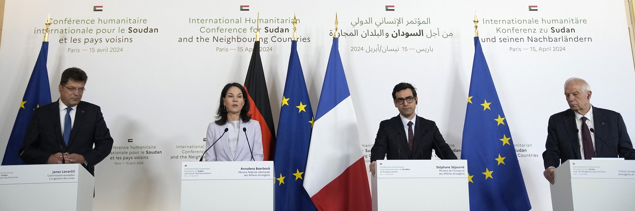 當(dāng)?shù)貢r間2024年4月15日,法國巴黎,法國外交部長斯特凡納·塞茹爾內(nèi)(右二),德國外交部長安娜萊娜·貝爾伯克,歐盟危機管理專員約翰·萊納西奇(左)和歐盟外交與安全事務(wù)高級代表何塞普·博雷利參加了蘇丹及其鄰國國際人道主義會議的聯(lián)合新聞發(fā)布會。