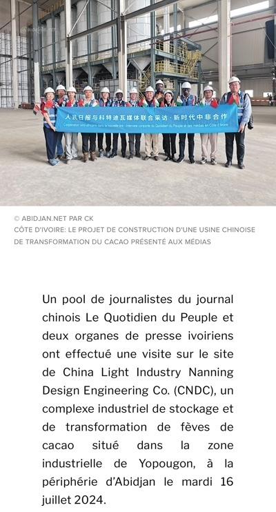 7月16日,人民日報(bào)與兩家科特迪瓦新聞機(jī)構(gòu)記者一行參觀了由中國輕工業(yè)南寧設(shè)計(jì)工程有限公司總承包的可可加工及可可豆倉庫建設(shè)項(xiàng)目,該項(xiàng)目坐落在阿比讓郊區(qū)的約普貢工業(yè)區(qū)。該公司負(fù)責(zé)人指出,該項(xiàng)目綜合體計(jì)劃于2024年年底完工,包括一個可加工5萬噸可可豆的工廠、可存儲14萬噸可可豆的倉庫以及培訓(xùn)中心、行政大樓等?!钥铺氐贤甙⒈茸尵W(wǎng)報(bào)道