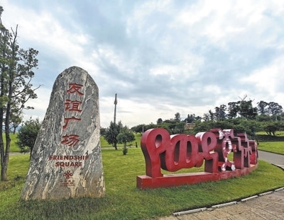 鐫刻著“友誼廣場(chǎng)”幾個(gè)中文大字的泰山石碑矗立在半山坡一片平地上。本報(bào)記者 任 彥攝