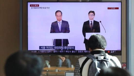12月8日,在韓國(guó)首爾火車站,民眾觀看韓國(guó)執(zhí)政黨黨首韓東勛與國(guó)務(wù)總理韓德洙(左)共同會(huì)見記者的電視直播。新華社記者 姚琪琳 攝