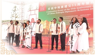 在近日舉辦的“慶祝中埃塞建交55周年暨歡樂春節(jié)活動(dòng)”上,當(dāng)?shù)孛癖姾铣H肀葋唫鹘y(tǒng)歌曲。