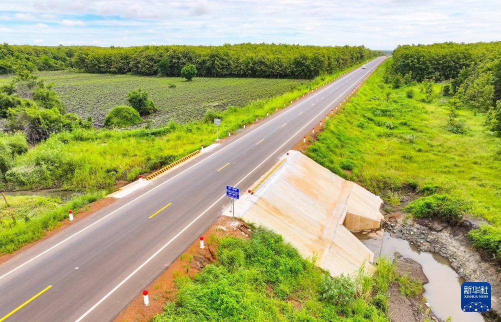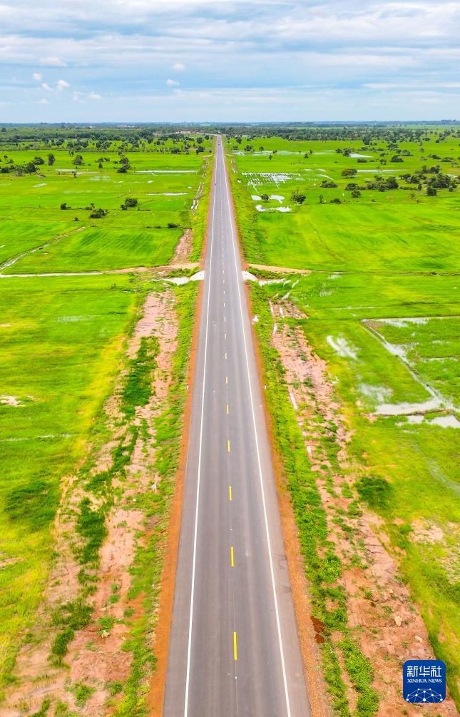 這是2024年7月14日在柬埔寨特本克蒙省拍攝的71C號(hào)國家公路(無人機(jī)照片)。新華社發(fā)(尼多拉攝)