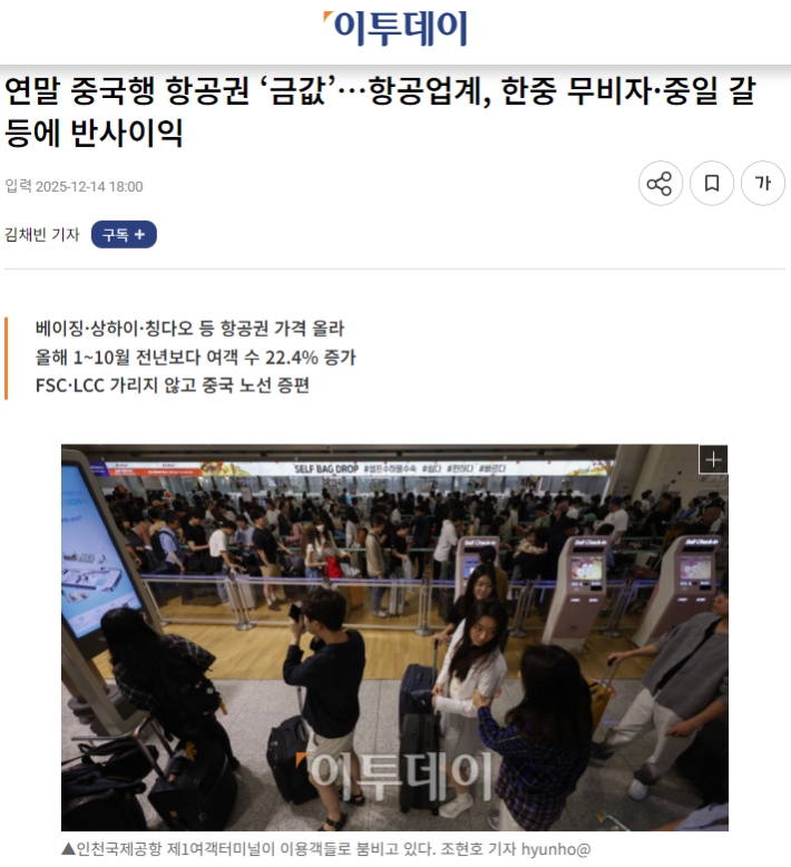 市場旺盛的需求直接傳導(dǎo)至價格層面。韓國《Etoday》近日一篇題為《年底飛往中國的航班“如同黃金般珍貴”》的報道,生動描繪了當(dāng)前中韓航線的熱度。報道指出,截至12月中旬,韓國飛往北京、上海、青島等主要中國城市的機(jī)票價格大幅上漲。例如,大韓航空執(zhí)飛的首爾-上海往返票價已漲至約40萬韓元,濟(jì)州航空的韓元-青島航線往返票價也接近30萬韓元。業(yè)內(nèi)分析指出,即便考慮季節(jié)性因素,當(dāng)前票價仍比去年同期高出約20%。來往中韓“一票難求”,華燈初上的明洞和外灘,熱氣騰騰的烤肉與火鍋,游客們的熱情互動給這個寒冷的冬天帶來暖意。
