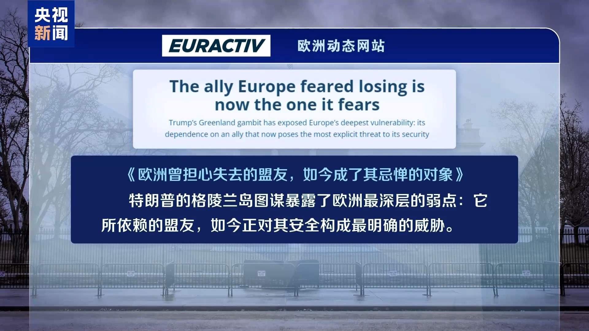 歐洲動態(tài)網(wǎng)站6日以《歐洲曾擔(dān)心失去的盟友,如今成了其忌憚的對象》為題評論說,“特朗普的格陵蘭島圖謀暴露了歐洲最深層的弱點:它所依賴的盟友,如今正對其安全構(gòu)成最明確的威脅?!蔽恼逻€提醒說,我們正進入一個“強權(quán)即公理”的新世界——而歐洲人對此毫無準備?;蛟S,格陵蘭島可能帶來的羞辱,將促使歐洲人反思這一現(xiàn)狀,并最終采取行動改變局面。