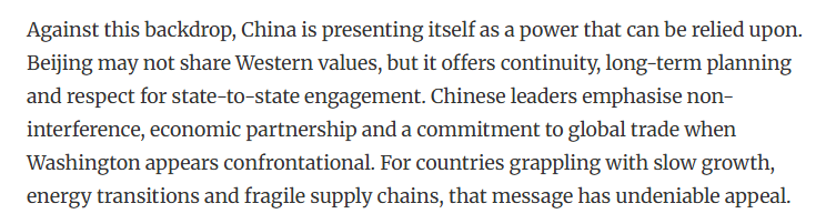 文章認(rèn)為,在此背景下,中國(guó)是可靠力量。中國(guó)提供了連續(xù)性、長(zhǎng)期規(guī)劃和尊重國(guó)家間的交流。中國(guó)強(qiáng)調(diào)不干涉、經(jīng)濟(jì)伙伴關(guān)系和對(duì)維護(hù)全球貿(mào)易。對(duì)于那些正面臨增長(zhǎng)緩慢、能源轉(zhuǎn)型和供應(yīng)鏈脆弱的國(guó)家來(lái)說(shuō),這一主張具有不可否認(rèn)的吸引力。另外,中國(guó)與美國(guó)不同,中國(guó)并不要求合作時(shí)必須實(shí)現(xiàn)意識(shí)形態(tài)上的一致性。中國(guó)提供市場(chǎng)、投資和交流。在不確定的時(shí)代,這些反而更體現(xiàn)了一種穩(wěn)定。