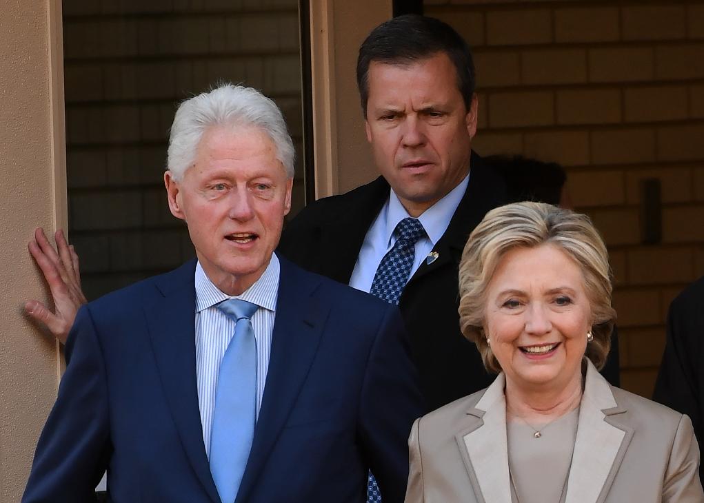 2016年11月8日,在美國(guó)紐約州查帕闊一處投票站,希拉里·克林頓(前右)與她的丈夫、前總統(tǒng)比爾·克林頓參加大選投票。新華社記者殷博古攝
