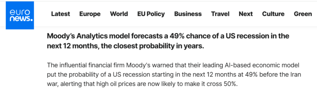 美政府接連出手的背后是疲軟的經(jīng)濟(jì)與通脹的預(yù)期無(wú)法承受高油價(jià)。而放任針對(duì)能源基礎(chǔ)設(shè)施的襲擊將進(jìn)一步威脅全球能源供應(yīng),推高油價(jià)。目前美國(guó)汽油價(jià)格已飆升至自2023年以來(lái)的最高水平,而據(jù)歐洲新聞臺(tái)3月18日?qǐng)?bào)道,穆迪分析(Moody's Analytics)模型預(yù)測(cè),未來(lái)12個(gè)月內(nèi)美國(guó)經(jīng)濟(jì)陷入衰退的概率為49%,這是多年來(lái)最接近臨界點(diǎn)的一次。該模型還提醒稱,當(dāng)前高企的油價(jià)很可能使這一概率突破50%。