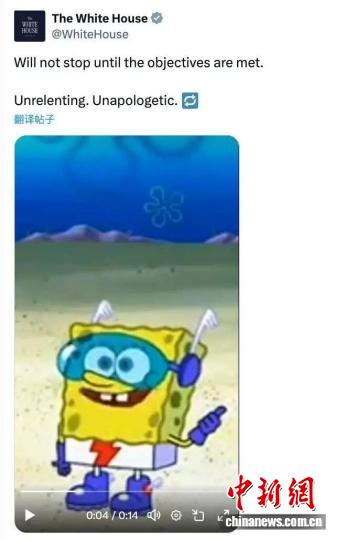 這是美國白宮社交媒體賬號(hào)截圖。該賬號(hào)發(fā)布的這段視頻中,海綿寶寶、電子游戲的歡快旋律與空襲伊朗的火光被剪輯在一起,視頻配發(fā)文字“不達(dá)目的不罷休”。