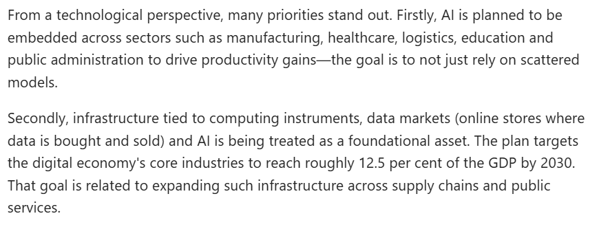 文章認(rèn)為,首先,人工智能被規(guī)劃融入制造業(yè)、醫(yī)療、物流、教育及公共管理等領(lǐng)域,以提升生產(chǎn)力,其目標(biāo)是不再局限于零散的應(yīng)用模式。其次,與計(jì)算設(shè)備、數(shù)據(jù)市場(chǎng)及人工智能相關(guān)的基礎(chǔ)設(shè)施,正被視作一種基礎(chǔ)性資產(chǎn)。規(guī)劃綱要提出,“十五五”時(shí)期數(shù)字經(jīng)濟(jì)核心產(chǎn)業(yè)增加值占國(guó)內(nèi)生產(chǎn)總值比重達(dá)到12.5%。這一目標(biāo)與在供應(yīng)鏈及公共服務(wù)領(lǐng)域擴(kuò)展此類基礎(chǔ)設(shè)施密切相關(guān)。