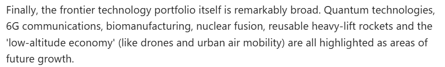 文章還注意到,當(dāng)前,中國(guó)繼續(xù)要求在科學(xué)技術(shù)等多個(gè)領(lǐng)域取得突破。這意味著,中國(guó)需要在整個(gè)技術(shù)體系層面構(gòu)建抗壓能力,而非依賴個(gè)別領(lǐng)域的孤立進(jìn)展。此外,規(guī)劃綱要所涵蓋的前沿技術(shù)領(lǐng)域極為廣泛。量子技術(shù)、第六代移動(dòng)通信技術(shù)、生物制造、核聚變、可復(fù)用重型運(yùn)載火箭以及“低空經(jīng)濟(jì)”(包括無(wú)人機(jī)與城市空中交通)等,均被明確為未來(lái)發(fā)展的重點(diǎn)方向。
