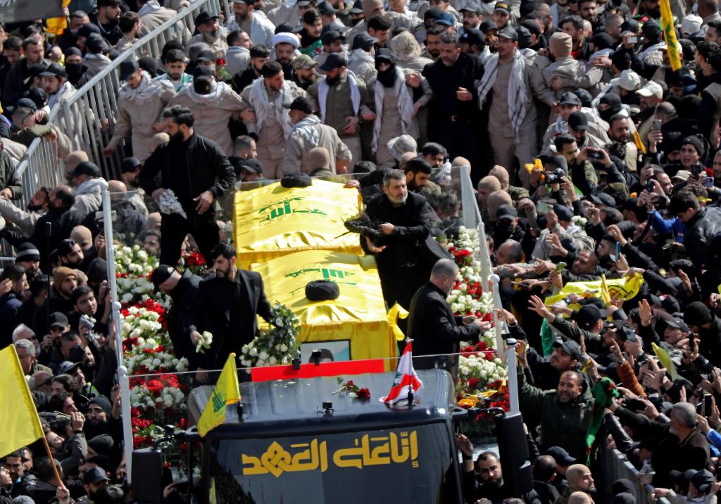 2025年2月23日,在黎巴嫩貝魯特,真主黨支持者參加真主黨前領導人納斯魯拉和薩菲丁的葬禮。新華社發(fā)(比拉爾·賈維希攝)