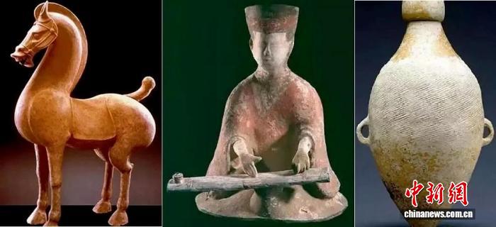 法國(guó)集美博物館藏(左起)東漢時(shí)期陶立馬 、 漢代彈箏陶俑彩色陶、仰韶文化半坡時(shí)期繭形雙耳瓶。圖片來(lái)源:人民網(wǎng)