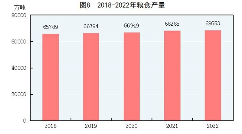全年糧食產(chǎn)量68653萬(wàn)噸,比上年增加368萬(wàn)噸,增產(chǎn)0.5%。其中,夏糧產(chǎn)量14740萬(wàn)噸,增產(chǎn)1.0%;早稻產(chǎn)量2812萬(wàn)噸,增產(chǎn)0.4%;秋糧產(chǎn)量51100萬(wàn)噸,增產(chǎn)0.4%。全年谷物產(chǎn)量63324萬(wàn)噸,比上年增產(chǎn)0.1%。其中,稻谷產(chǎn)量20849萬(wàn)噸,減產(chǎn)2.0%;小麥產(chǎn)量13772萬(wàn)噸,增產(chǎn)0.6%;玉米產(chǎn)量27720萬(wàn)噸,增產(chǎn)1.7%。大豆產(chǎn)量2028萬(wàn)噸,增產(chǎn)23.7%。