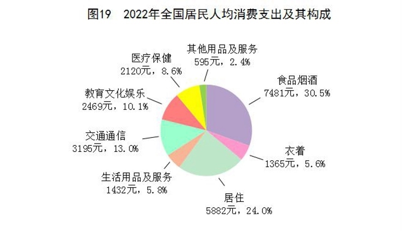 全年全國(guó)居民人均消費(fèi)支出24538元,比上年增長(zhǎng)1.8%,扣除價(jià)格因素,實(shí)際下降0.2%。其中,人均服務(wù)性消費(fèi)支出[54]10590元,比上年下降0.5%,占居民人均消費(fèi)支出的比重為43.2%。按常住地分,城鎮(zhèn)居民人均消費(fèi)支出30391元,增長(zhǎng)0.3%,扣除價(jià)格因素,實(shí)際下降1.7%;農(nóng)村居民人均消費(fèi)支出16632元,增長(zhǎng)4.5%,扣除價(jià)格因素,實(shí)際增長(zhǎng)2.5%。全國(guó)居民恩格爾系數(shù)為30.5%,其中城鎮(zhèn)為29.5%,農(nóng)村為33.0%。