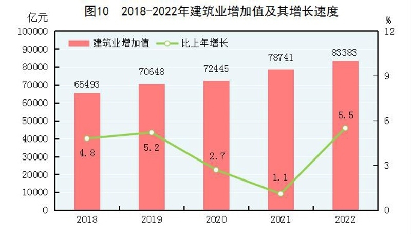全年建筑業(yè)增加值83383億元,比上年增長(zhǎng)5.5%。全國(guó)具有資質(zhì)等級(jí)的總承包和專(zhuān)業(yè)承包建筑業(yè)企業(yè)利潤(rùn)8369億元,比上年下降1.2%,其中國(guó)有控股企業(yè)3922億元,增長(zhǎng)8.4%。