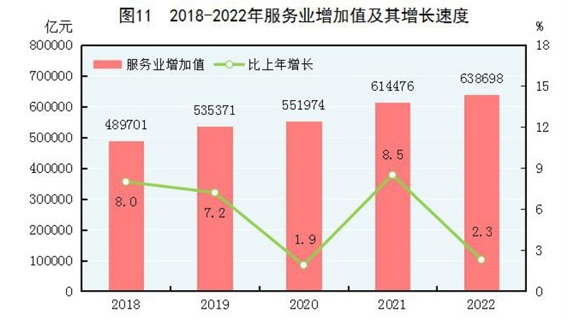 全年批發(fā)和零售業(yè)增加值114518億元,比上年增長(zhǎng)0.9%;交通運(yùn)輸、倉(cāng)儲(chǔ)和郵政業(yè)增加值49674億元,下降0.8%;住宿和餐飲業(yè)增加值17855億元,下降2.3%;金融業(yè)增加值96811億元,增長(zhǎng)5.6%;房地產(chǎn)業(yè)增加值73821億元,下降5.1%;信息傳輸、軟件和信息技術(shù)服務(wù)業(yè)增加值47934億元,增長(zhǎng)9.1%;租賃和商務(wù)服務(wù)業(yè)增加值39153億元,增長(zhǎng)3.4%。全年規(guī)模以上服務(wù)業(yè)企業(yè)營(yíng)業(yè)收入比上年增長(zhǎng)2.7%,利潤(rùn)總額增長(zhǎng)8.5%。