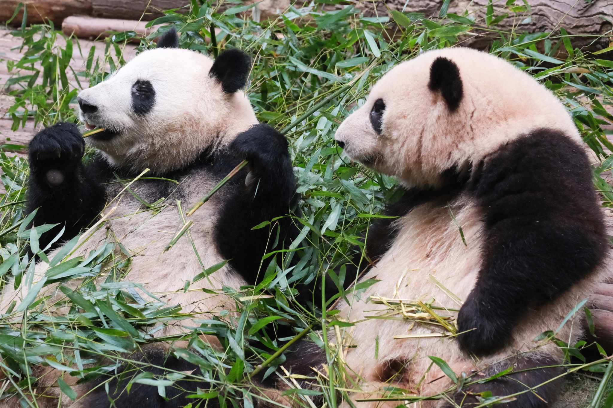成都:大熊貓和花和葉姐弟早起吃竹子