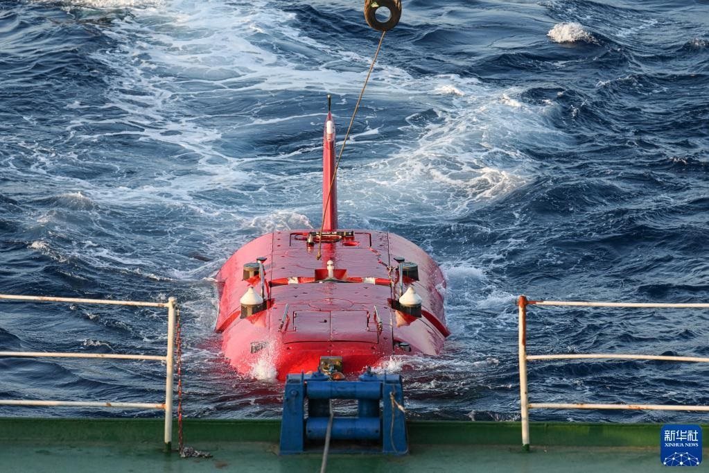 在結(jié)束當(dāng)日的水下調(diào)查后,搭載著考古隊(duì)員的“深海勇士”號(hào)載人潛水器浮出海面(5月27日攝)。