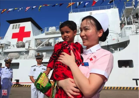 2013年,“和平方舟”號醫(yī)院船再次來到孟加拉國。上萬民眾自發(fā)涌向中國醫(yī)院船,最高單日門診1700余人次。3歲的阿里法·沁健康么?中國軍醫(yī)牽掛著她。她家住在偏僻農(nóng)村,中國軍醫(yī)設(shè)法找到了她,邀請她登上“和平方舟”號醫(yī)院船體檢。