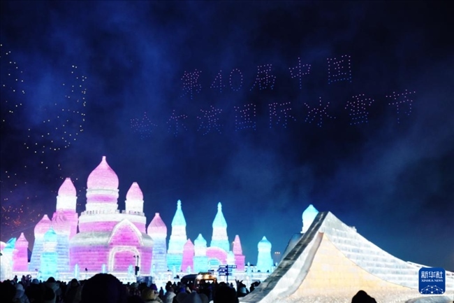 1月5日,在哈爾濱冰雪大世界園區(qū),游客在觀看哈爾濱國(guó)際冰雪節(jié)開(kāi)幕式上的無(wú)人機(jī)表演。當(dāng)日,第40屆中國(guó)·哈爾濱國(guó)際冰雪節(jié)開(kāi)幕,吸引眾多游客。新華社記者 王建威 攝