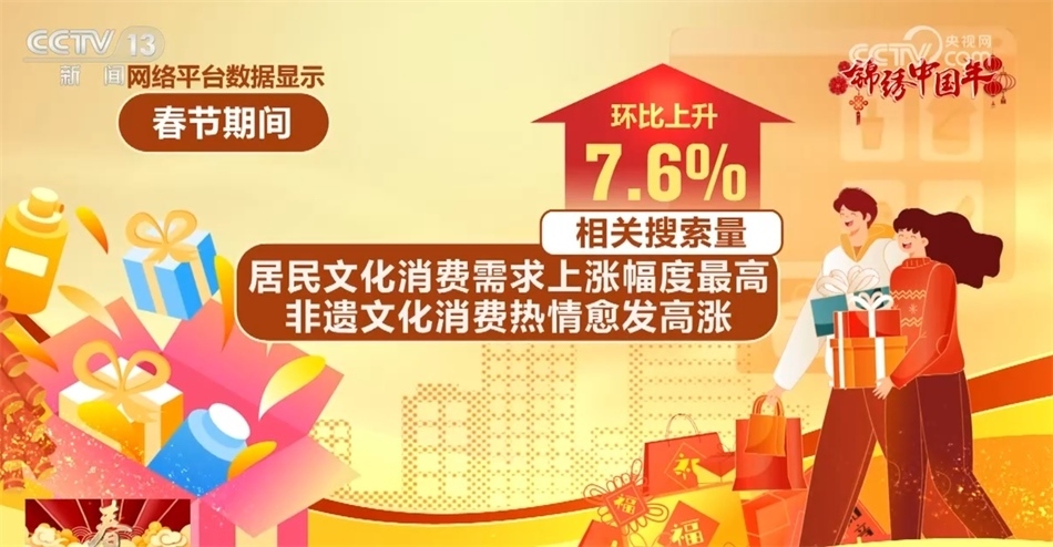 網絡平臺數(shù)據顯示,春節(jié)期間,居民文化消費需求上漲幅度最高,非遺文化消費熱情愈發(fā)高漲,相關搜索量環(huán)比上升7.6%。其中,非遺廟會、燈會最受游客歡迎。