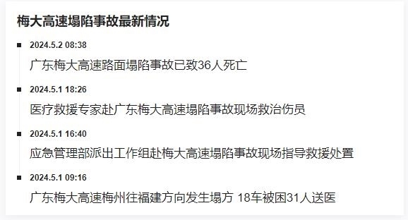 據(jù)廣東梅州大埔縣委宣傳部消息,5月1日凌晨2時(shí)10分許,梅大高速往福建方向K11+900m附近發(fā)生高速公路路面塌陷事故。至5月2日早上5時(shí)30分,已發(fā)現(xiàn)23輛車陷落,36人死亡,30人受傷(無生命危險(xiǎn))。
