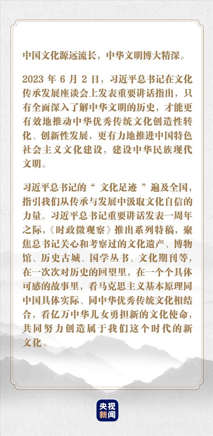 “這段時(shí)間,我一直在思考推進(jìn)中國特色社會(huì)主義文化建設(shè)、建設(shè)中華民族現(xiàn)代文明這個(gè)重大問題。”2023年6月2日,在文化傳承發(fā)展座談會(huì)上,習(xí)近平總書記指出,“只有全面深入了解中華文明的歷史,才能更有效地推動(dòng)中華優(yōu)秀傳統(tǒng)文化創(chuàng)造性轉(zhuǎn)化、創(chuàng)新性發(fā)展,更有力地推進(jìn)中國特色社會(huì)主義文化建設(shè),建設(shè)中華民族現(xiàn)代文明?!?/p>