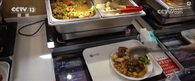 正值飯點(diǎn),趙靚和同事來到單位附近的新安街道居家養(yǎng)老服務(wù)中心內(nèi)的社區(qū)智惠食堂就餐,兩個人選了5個菜,總共花費(fèi)30多元。