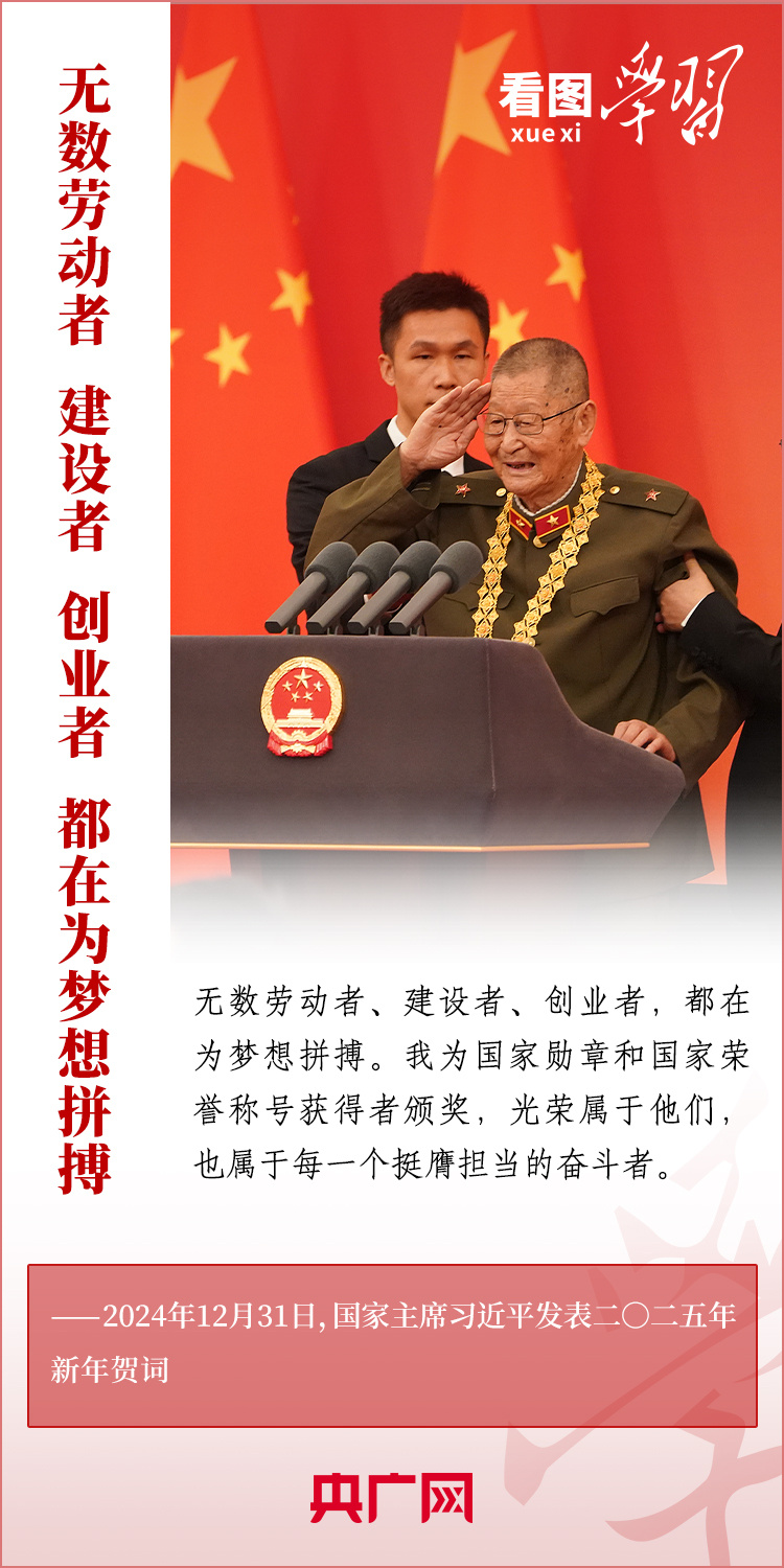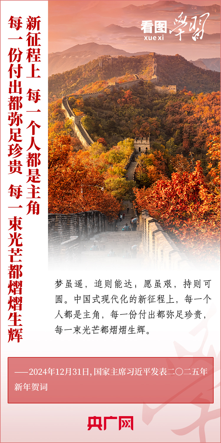 “夢雖遙,追則能達(dá);愿雖艱,持則可圓?!毙履昵跋?,習(xí)近平主席發(fā)表二〇二五年新年賀詞。在溫暖有力的講述中,習(xí)主席深情回望過去一年中國不平凡的奮斗歷程、精彩瞬間,感慨大家一道經(jīng)歷的風(fēng)雨彩虹、難忘時(shí)刻,贊美無數(shù)為夢想拼搏的勞動者、建設(shè)者、創(chuàng)業(yè)者。習(xí)主席說,中國式現(xiàn)代化的新征程上,每一個(gè)人都是主角,每一份付出都彌足珍貴,每一束光芒都熠熠生輝。讓我們充滿信心,在新的一年接續(xù)奮斗!