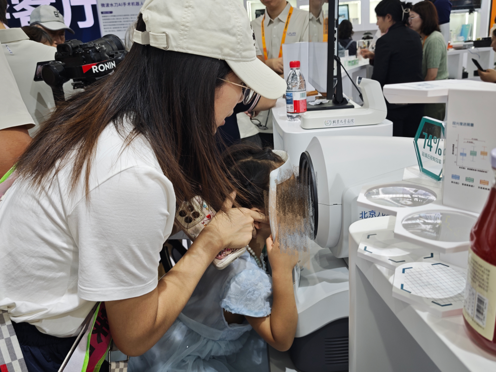 在2025年服貿(mào)會健康衛(wèi)生服務(wù)專題展,一位工作人員帶著小朋友體驗智能屈光篩查儀。新華社記者 劉禎 攝