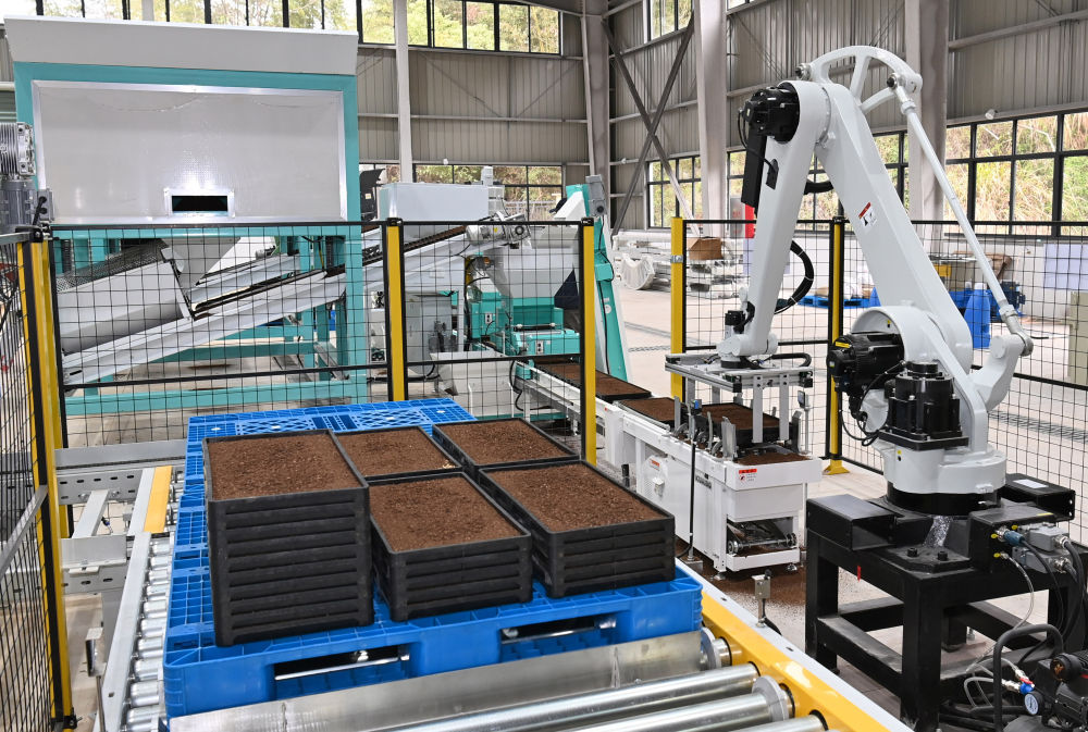 在浙江省東陽(yáng)市皇野生態(tài)農(nóng)業(yè)有限公司現(xiàn)代農(nóng)事服務(wù)中心,全自動(dòng)智能水稻育秧生產(chǎn)線在制作秧盤(2025年3月13日攝)。新華社發(fā)(包康軒 攝)