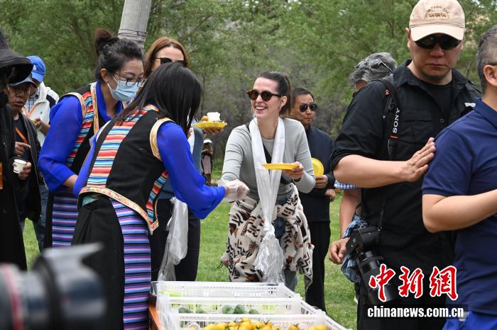 2025年6月5日,105位境外游客組成的國際旅行商考察團走進西藏山南市瓊結(jié)縣強吉村。他們參觀古建活化項目,觀看非遺展演,體驗鄉(xiāng)村露營。 中新社記者 貢嘎來松 攝