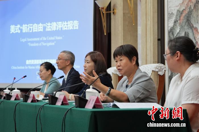8月25日,中國(guó)自然資源部海洋發(fā)展戰(zhàn)略研究所在北京發(fā)布《美式“航行自由”法律評(píng)估報(bào)告》中英文版。該《報(bào)告》旨在對(duì)美國(guó)“航行自由”相關(guān)主張和實(shí)踐是否符合國(guó)際條約和一般國(guó)際法、是否具備法律基礎(chǔ)進(jìn)行評(píng)估。圖為自然資源部海洋發(fā)展戰(zhàn)略研究所前所長(zhǎng)張海文(右二)答記者問。中新社記者 張祥毅 攝