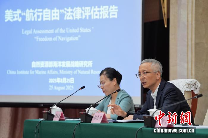 8月25日,中國(guó)自然資源部海洋發(fā)展戰(zhàn)略研究所在北京發(fā)布《美式“航行自由”法律評(píng)估報(bào)告》中英文版。該《報(bào)告》旨在對(duì)美國(guó)“航行自由”相關(guān)主張和實(shí)踐是否符合國(guó)際條約和一般國(guó)際法、是否具備法律基礎(chǔ)進(jìn)行評(píng)估。圖為上海交通大學(xué)日本研究中心副教授鄭志華(右)答記者問。中新社記者 張祥毅 攝