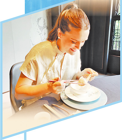 “很神奇,每一口的味道都不一樣,前一口嫩滑,下一口又緊實,接下來又有爆漿的感覺……”羅伯特持刀叉,羅梅羅熟練地使用筷子,兩人大快朵頤。