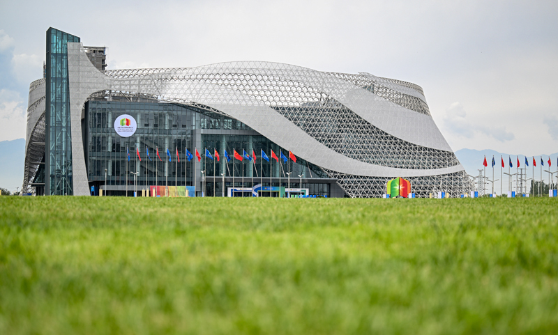 這是8月28日在寧夏銀川市拍攝的第七屆中國—阿拉伯國家博覽會開幕式舉辦地——寧夏國際會堂外景。