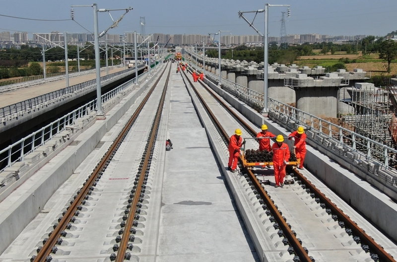 9月8日,施工人員在西十高鐵西安東至藍(lán)田區(qū)間鋪設(shè)無(wú)縫鋼軌(無(wú)人機(jī)照片)。