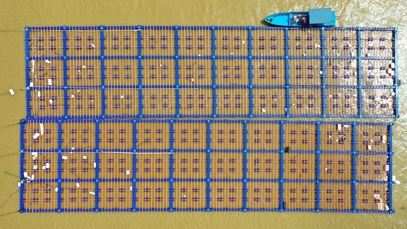 10月7日,當?shù)厝罕娫跈z查蠔排是否受損(無人機照片)。