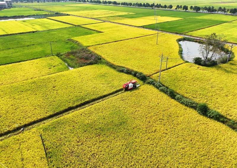 10月11日,湖南省衡陽市衡山縣白果鎮(zhèn)村民駕駛農機收割稻谷(無人機照片)。