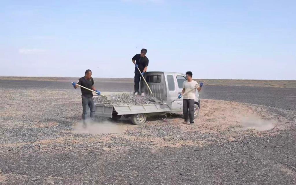 “看到車輪碾過標(biāo)語那一刻,就像碾在歷史的脊梁上。”網(wǎng)絡(luò)博主陸遙得知標(biāo)語被破壞后,主動驅(qū)車兩千多公里,經(jīng)歷六天抵達(dá)哈密。他和朋友們拉運20噸砂石,才終于修復(fù)這些“疤痕”。