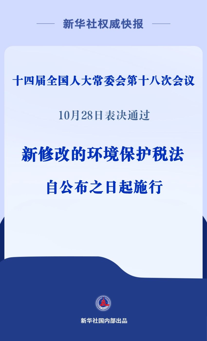 十四屆全國人大常委會第十八次會議10月28日表決通過關于修改環(huán)境保護稅法的決定,并自公布之日起施行。