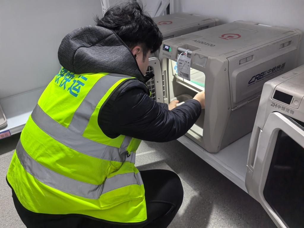 中鐵快運(yùn)太原南站營業(yè)部業(yè)務(wù)負(fù)責(zé)人武鑫介紹:“我們自今年10月啟動高鐵寵物托運(yùn)服務(wù)試點(diǎn)以來,已經(jīng)托運(yùn)過寵物貓、寵物狗等。旅客可以在12306官方平臺或到營業(yè)部現(xiàn)場辦理托運(yùn)業(yè)務(wù)。托運(yùn)前,需要提交相關(guān)部門的檢疫證明。工作人員會對寵物運(yùn)輸箱和列車環(huán)境進(jìn)行嚴(yán)格消毒。寵物運(yùn)輸箱內(nèi)還帶有攝像頭,主人可以通過監(jiān)控查看自家寵物的實(shí)時(shí)狀態(tài)。我們配備的工作人員,也會定時(shí)檢查寵物狀態(tài),提供必要的安撫和飲水?!?/p>