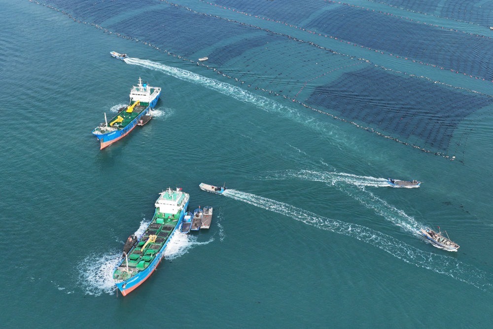 ↑ 11月10日,在山東省榮成市桑溝灣海洋牧場,養(yǎng)殖工人在養(yǎng)殖區(qū)穿梭作業(yè)(無人機照片)。新華社發(fā)(王福東 攝)