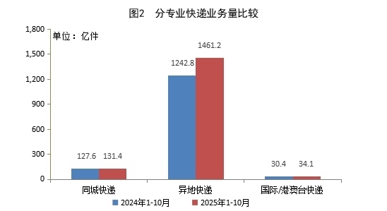 1—10月,同城快遞業(yè)務(wù)量累計(jì)完成131.4億件,同比增長3.0%;異地快遞業(yè)務(wù)量累計(jì)完成1461.2億件,同比增長17.6%;國際/港澳臺快遞業(yè)務(wù)量累計(jì)完成34.1億件,同比增長12.2%。