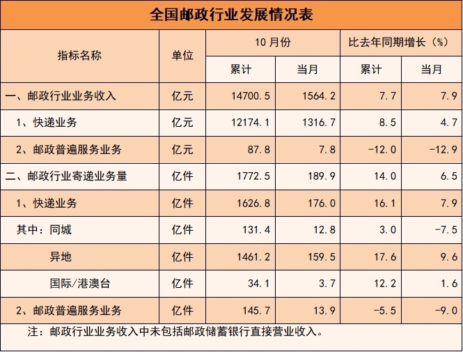 1—10月,郵政行業(yè)業(yè)務(wù)收入累計(jì)完成14700.5億元,同比增長7.7%。其中,快遞業(yè)務(wù)收入累計(jì)完成12174.1億元,同比增長8.5%。